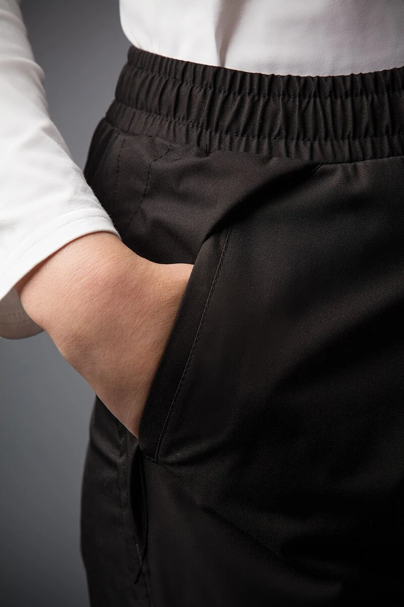 - Half elasticated waistband with double stud and cord adjuster. Anti-snag Velcro bonded ankle adjuster